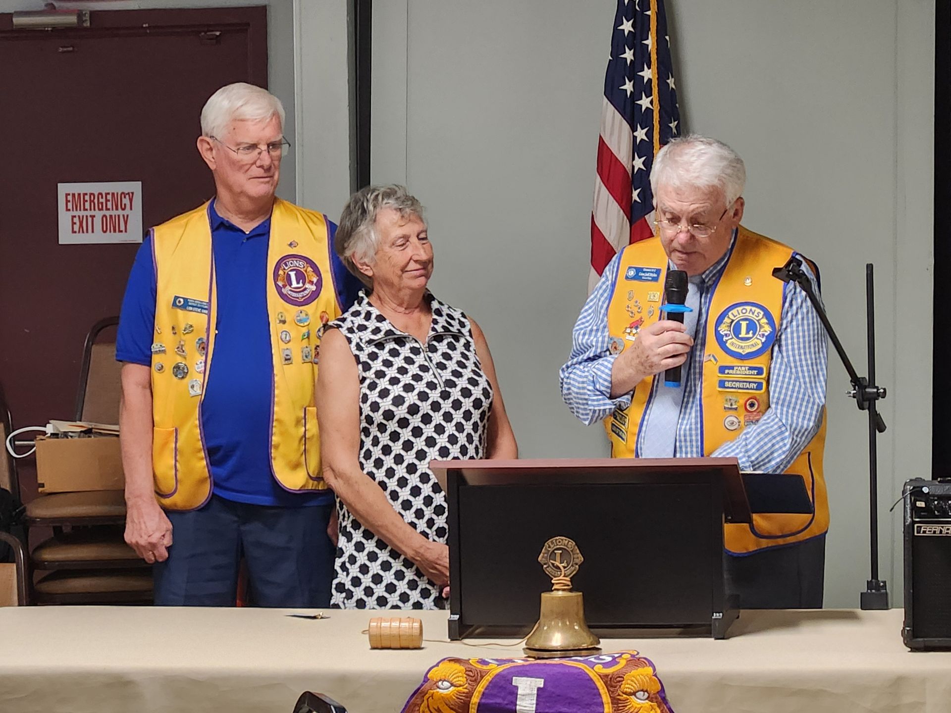 Punta Gorda Lion Reggie Weiss receives his 60 year membership chevron presented by Lion Monte Barksdale and Lion Jeanne Wells.
